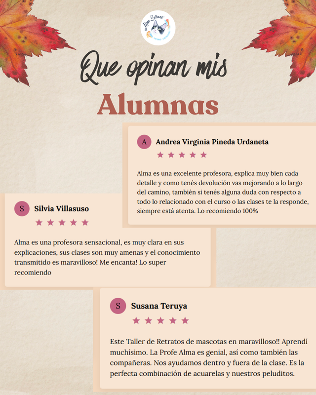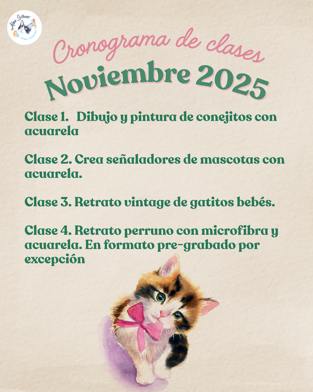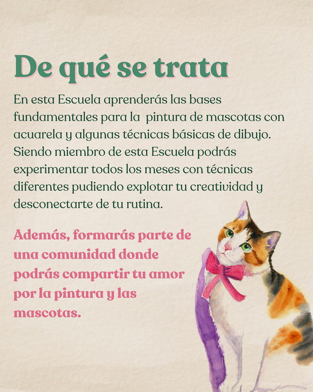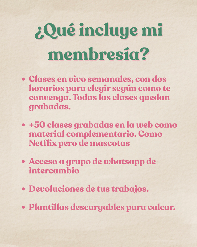 Tu membresía en esta escuela incluye clases en vivo semanales de 2hs y muchisimo material complementario grabado donde aprenderás a fondo el arte de retratar mascotas, desde el dibujo a la pintura con acuarelas abordando diferentes estilos para encontrar el tuyo personal.