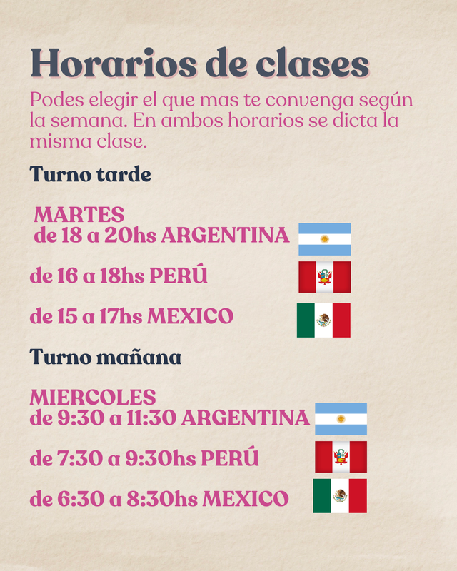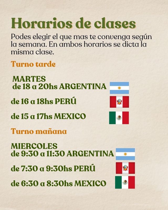 Los horarios se muestran en el huso horario Argentino. En los dos horarios se dicta la misma clase semanalmente, pero podes conectarte el dia que te convenga segun tu disponibilidad, con posibilidad de conectarte a ambas clases para repasar.