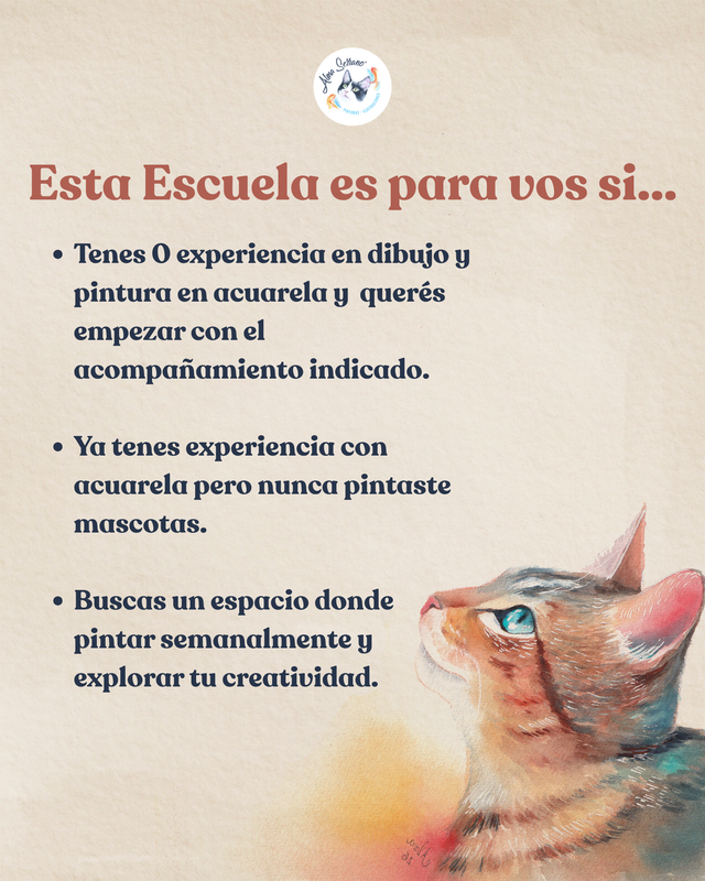Esta Escuela online incluye clases en vivo semanales de 2hs y muchisimo material complementario grabado donde aprenderás a fondo el arte de retratar mascotas, desde el dibujo a la pintura con acuarelas abordando diferentes estilos para encontrar el tuyo personal.